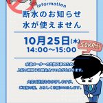 2025年9月19日 / 最終更新日 : 2025年9月19日 AService お知らせ 10月25日(木)断水のお知らせ。 水道メーターの交換工事の為、下記の期間中は館内全ての水が止まり使用することができません。大変ご迷惑をおかけしま […]