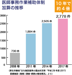 近年、ニーズが高まっているお仕事です病院勤務医の絶対数不足と医師の業務過多が問題となっています。2008 年の診療報酬改定で勤務医の負担を軽減するべく「医師事務作業補助体制加算」が新設され、スタッフの配置が認められました。また、2020